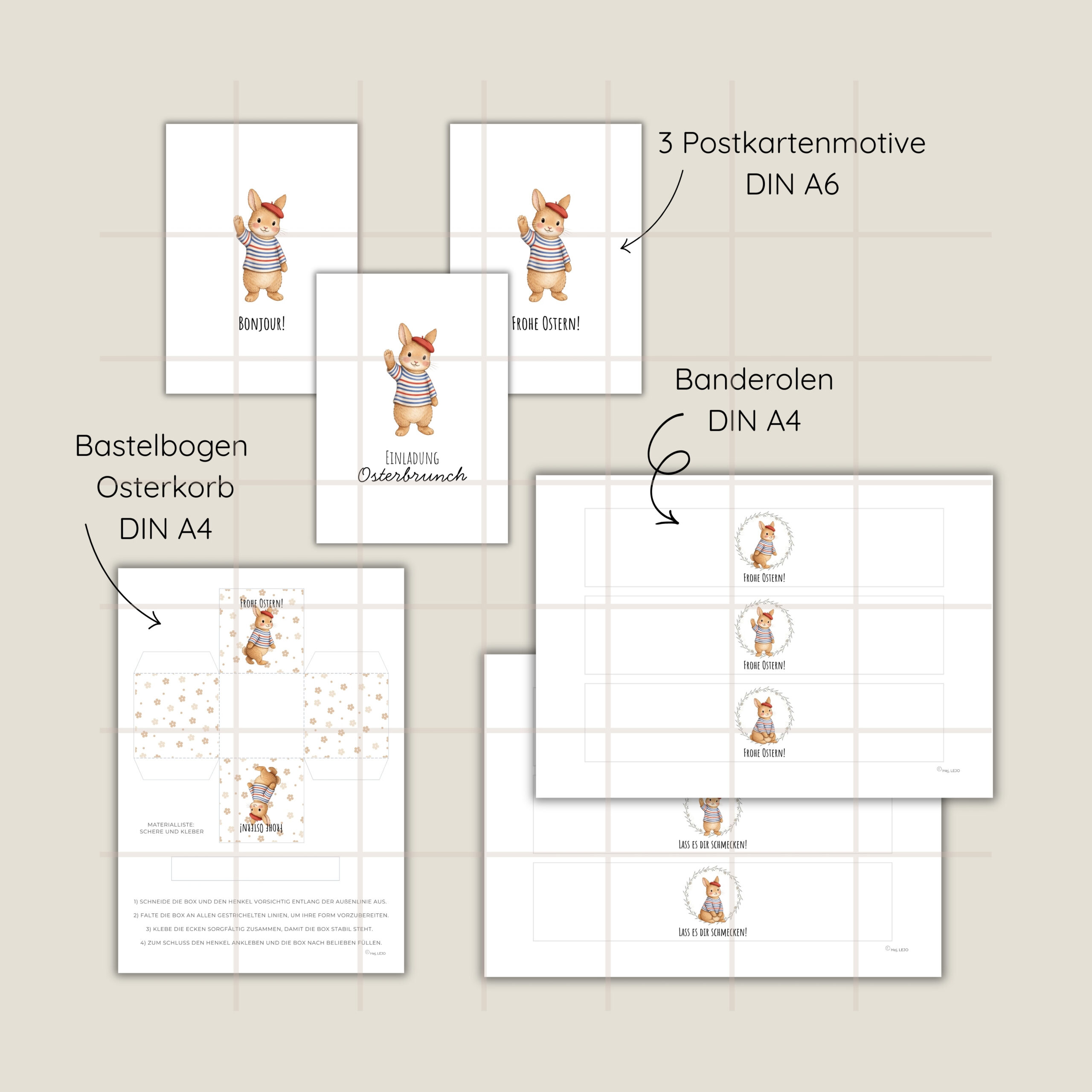 Komplettes Set für einen liebevoll abgestimmten Ostertisch inkl. Einladungskarten. Digitale Vorlage im PDF-Format.
