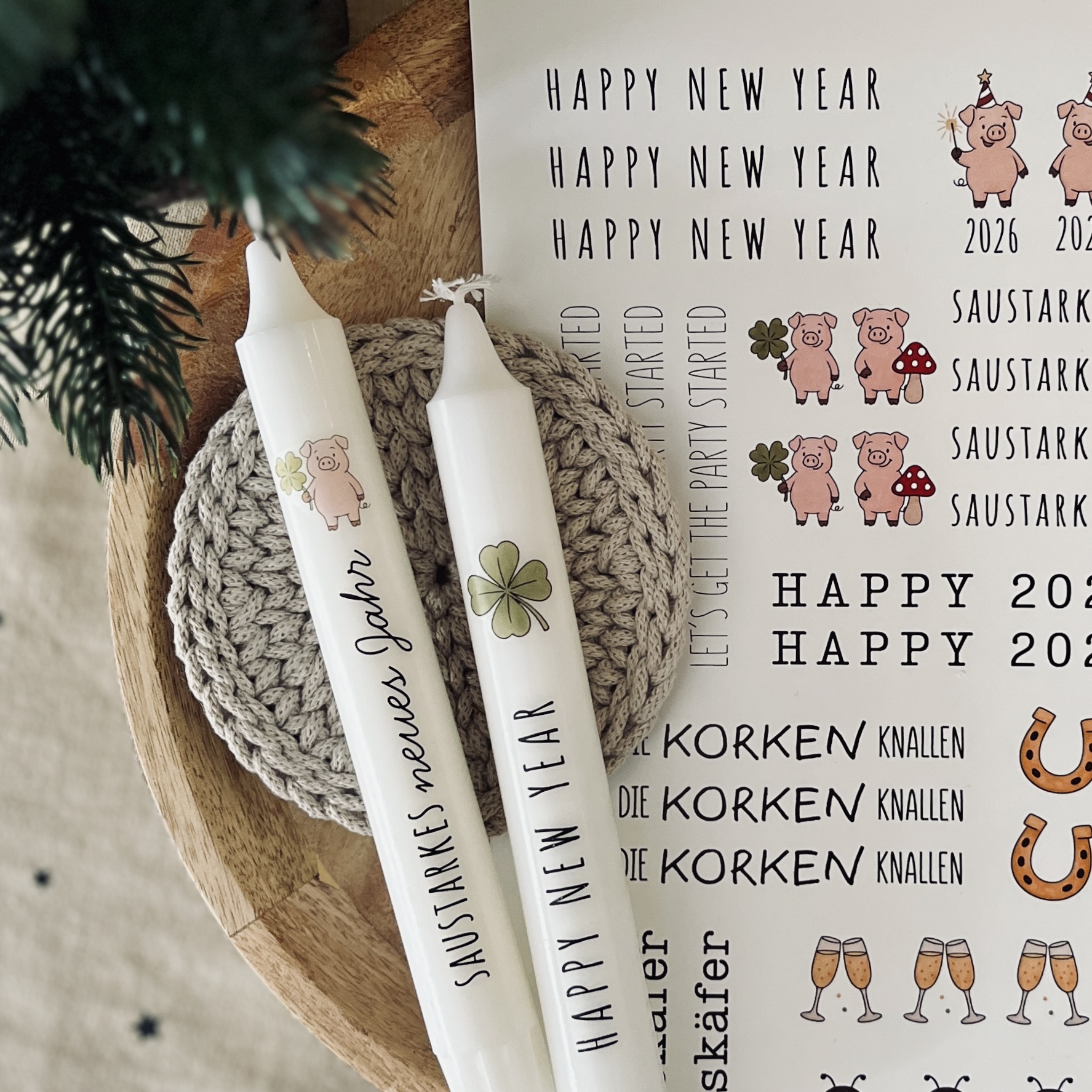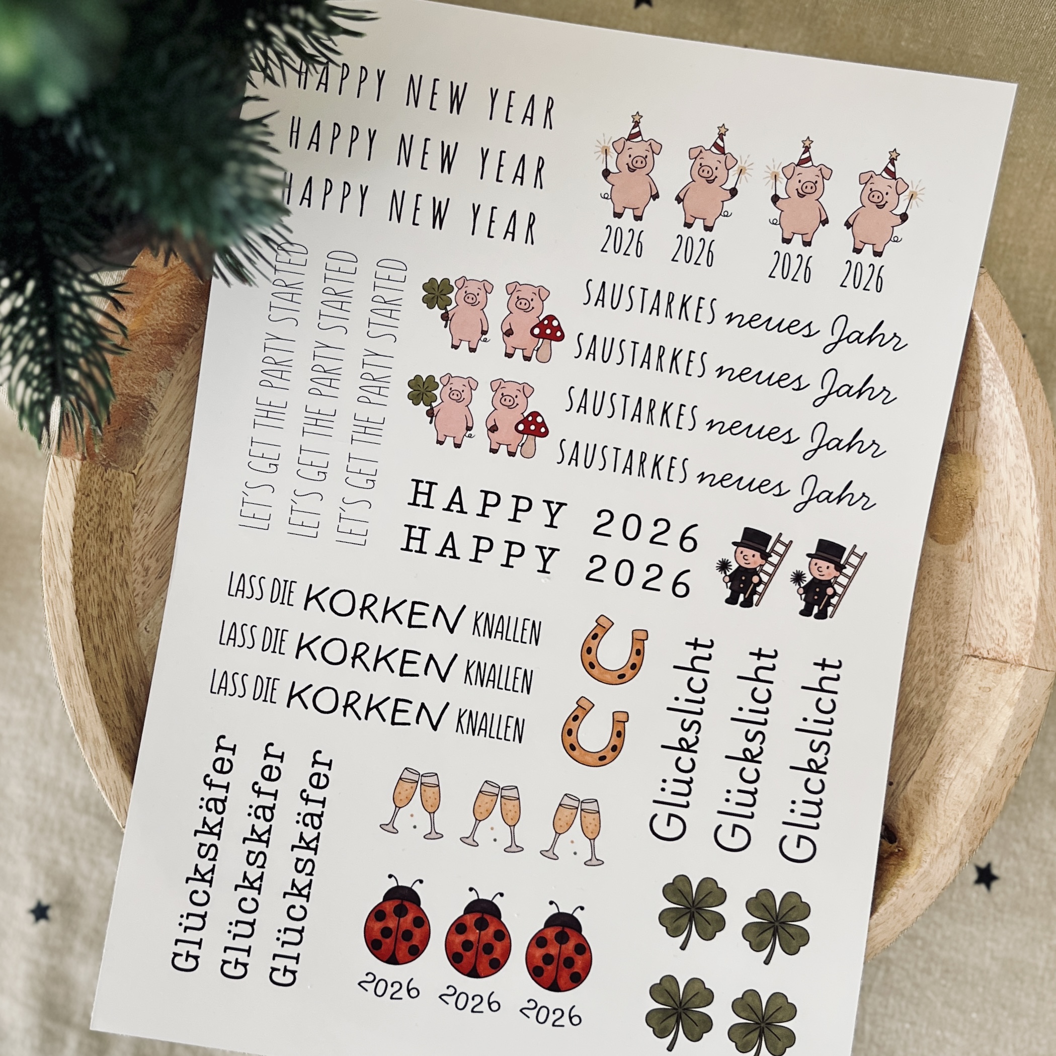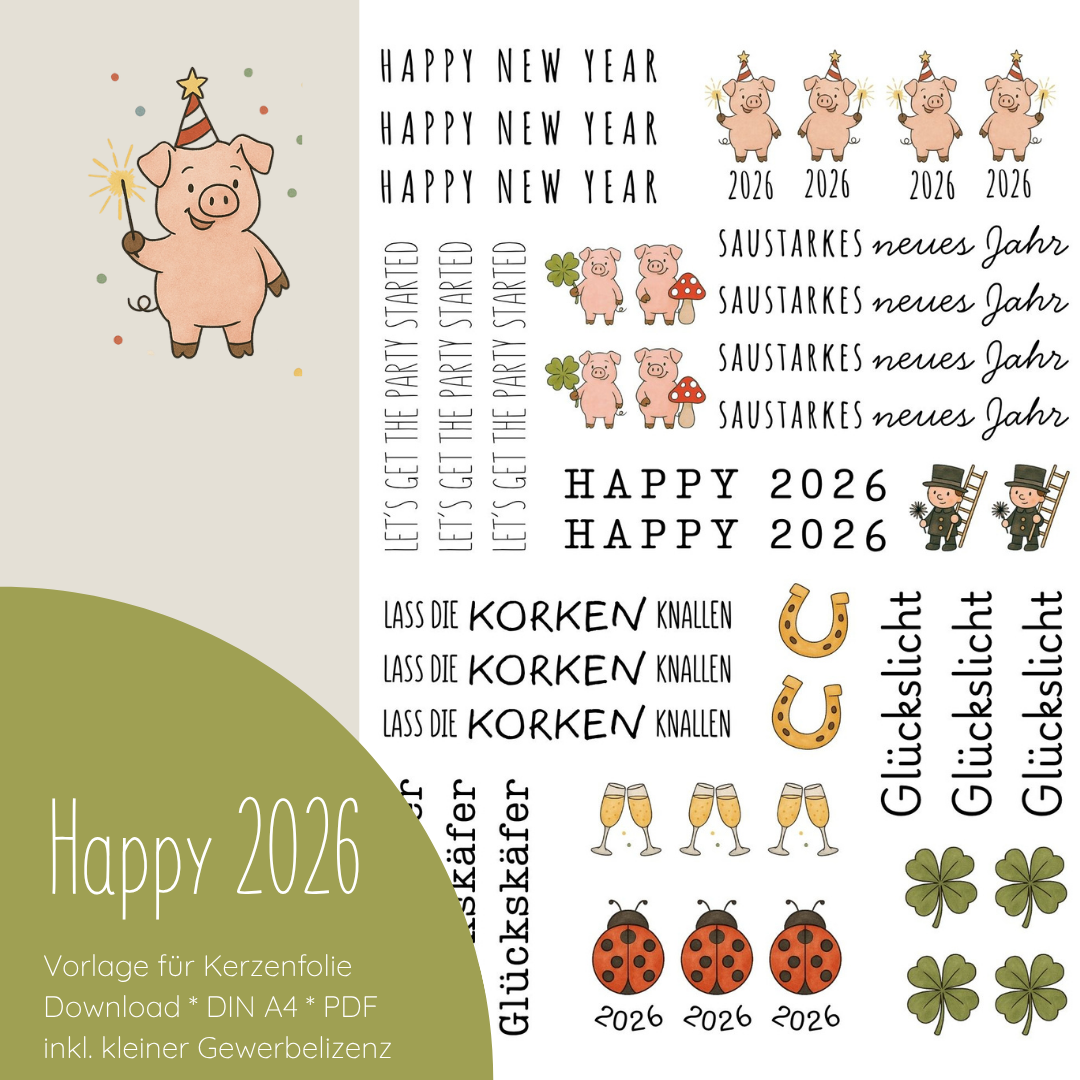Diese liebevoll gestaltete Designvorlage bringt den Charme vergangener Zeiten zurück. Mit klassischen Glückssymbolen wie Schwein, Kleeblatt, Marienkäfer und Hufeisen versprüht sie pure Nostalgie und ganz viel gute Laune fürs neue Jahr.