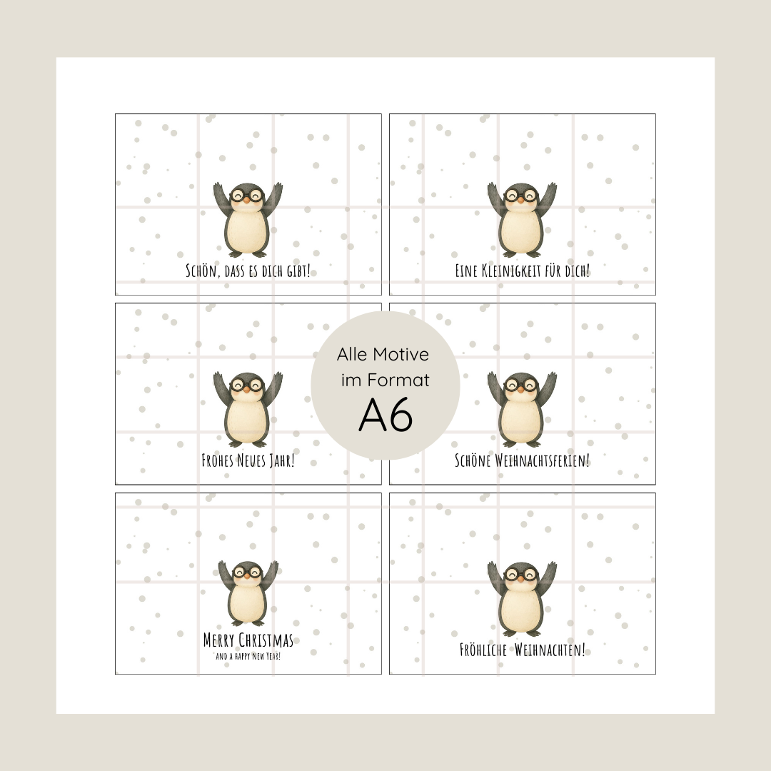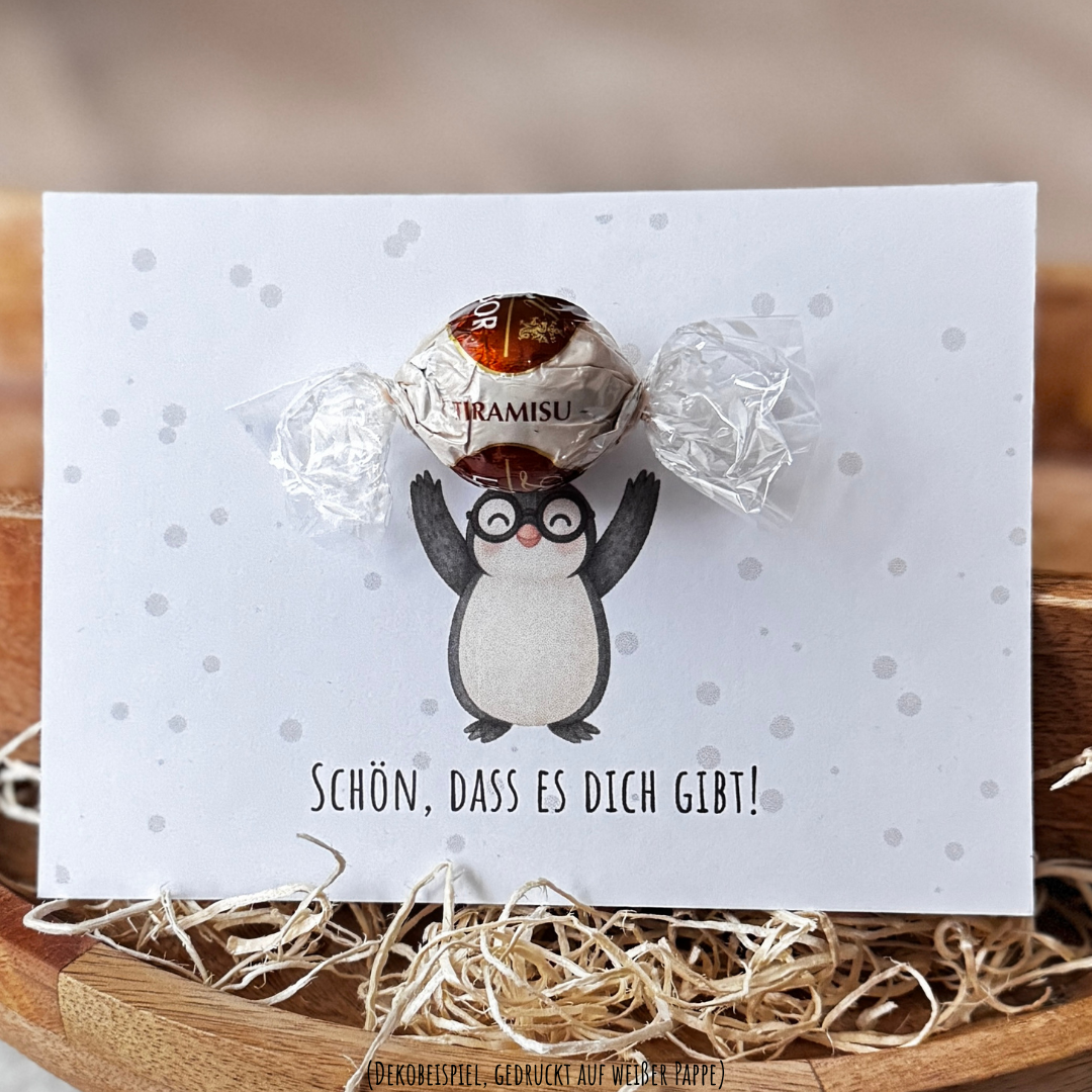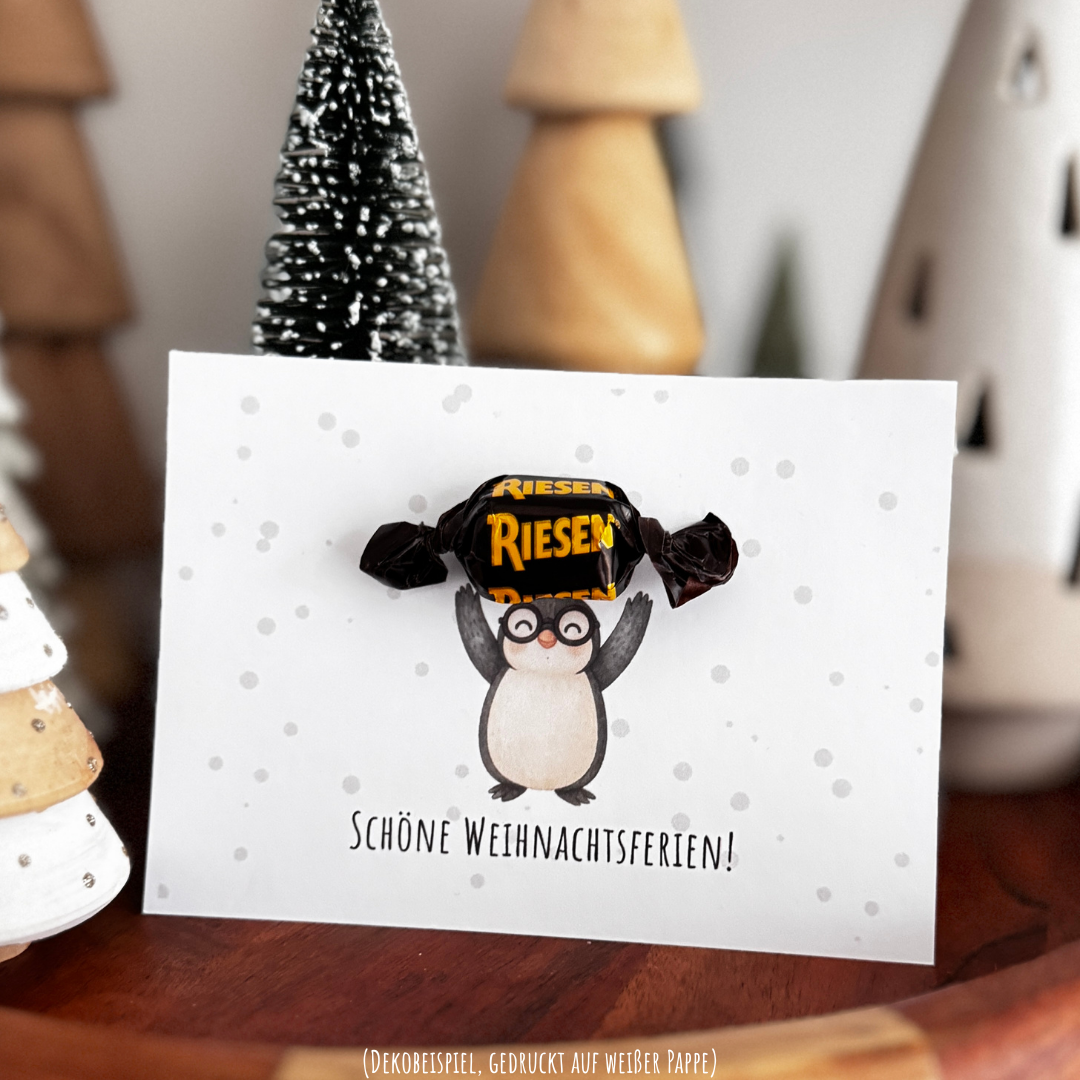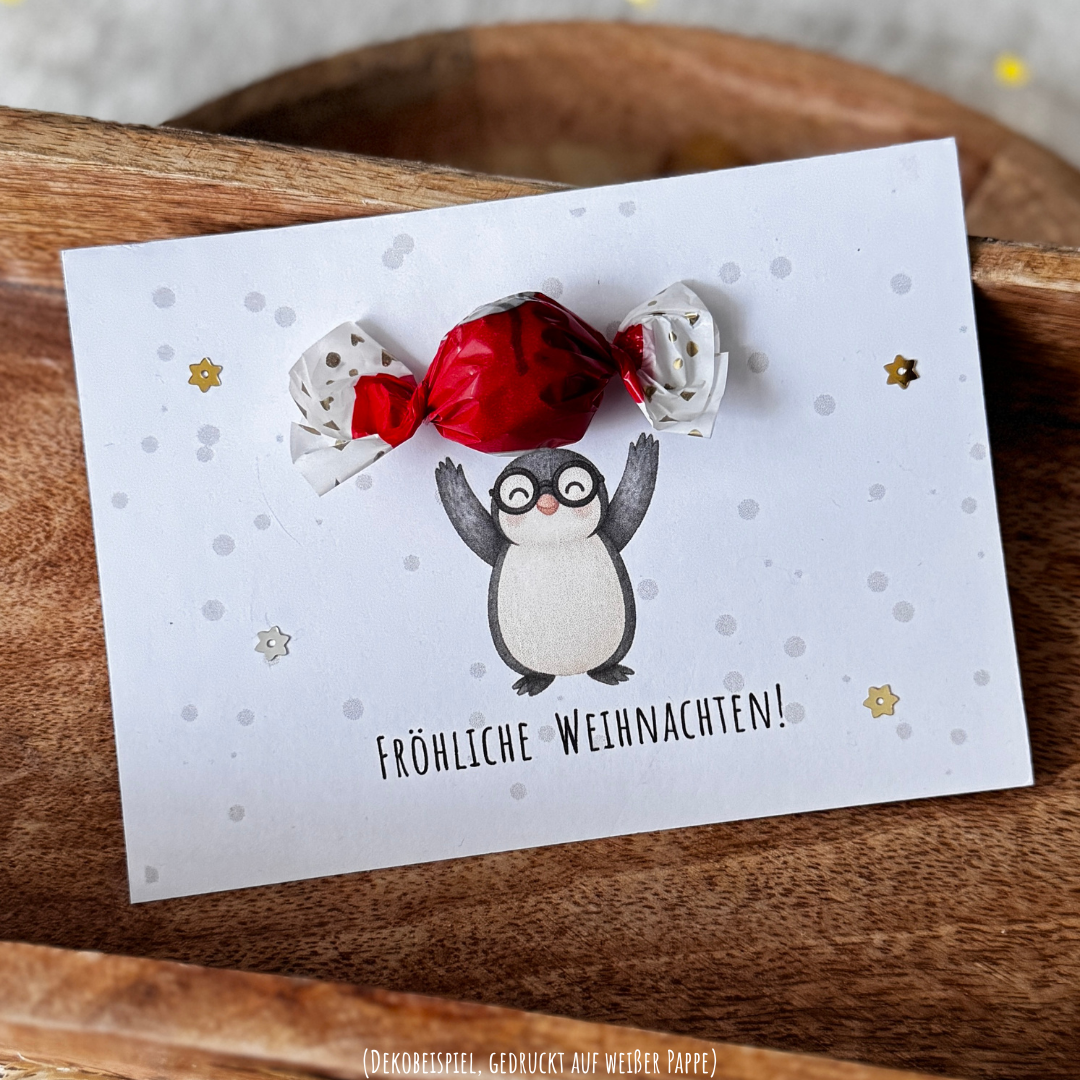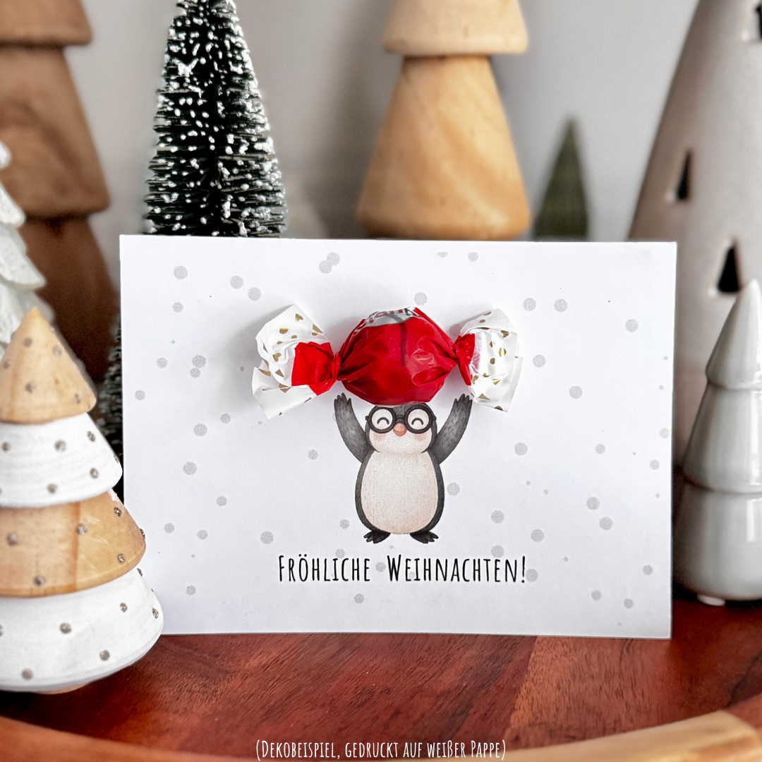 Diese liebevoll gestaltete Pinguin-Karte zeigt einen Pinguin, der behutsam ein Bonbon in seinen Flossen hält. Eine süße Freude, die von Herzen kommt und perfekt zur Weihnachtszeit passt.